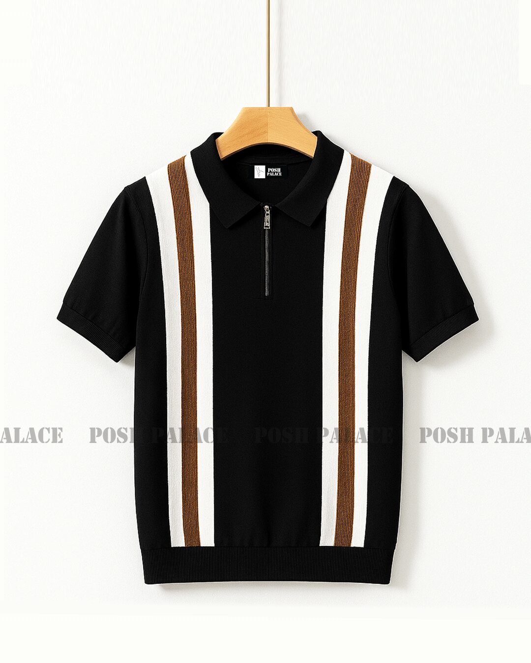 Keep your warm-weather wardrobe on point with the Vibe Vertical Black Premium Knit Polo Shirt from Posh Palace—where everyday performance meets luxe comfort.